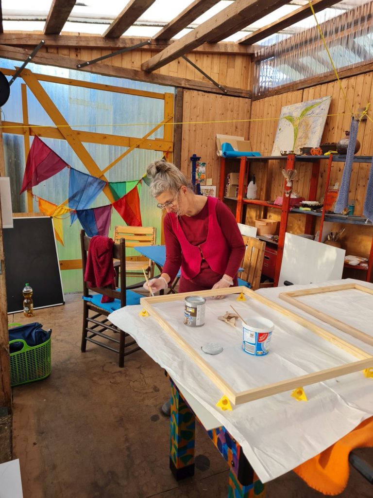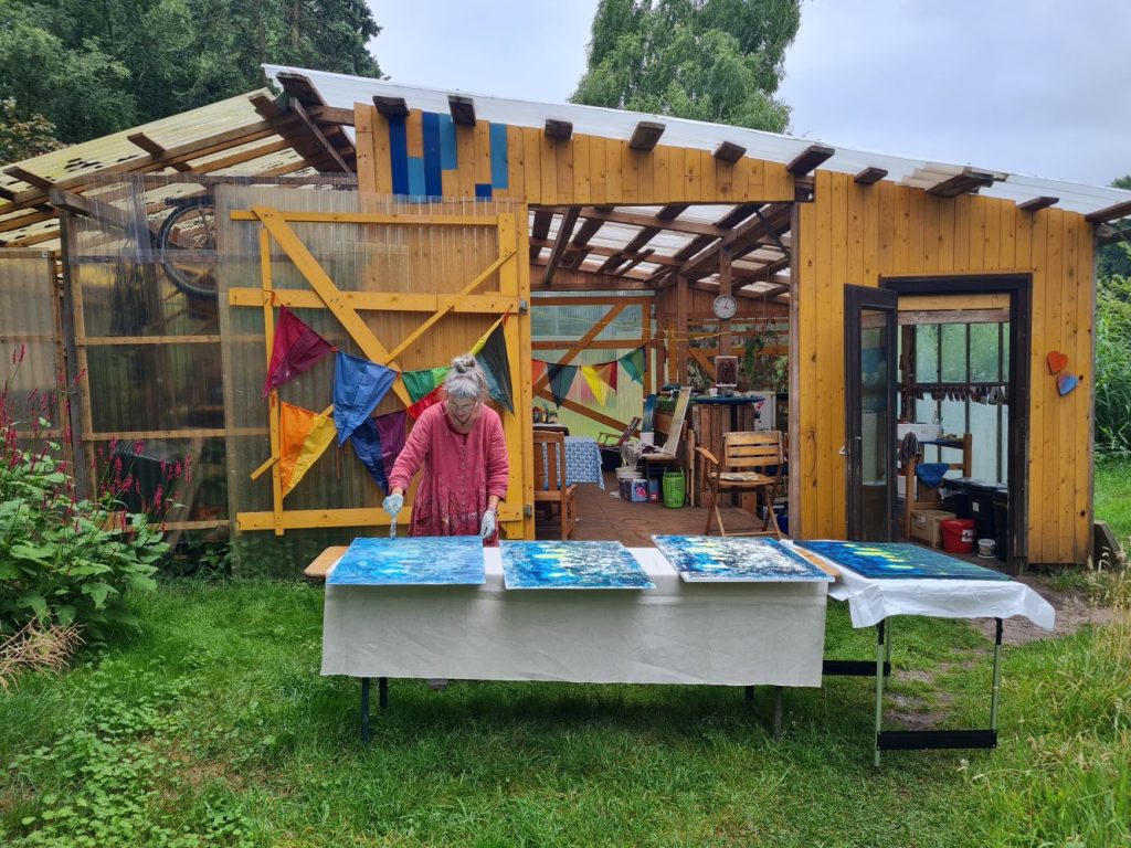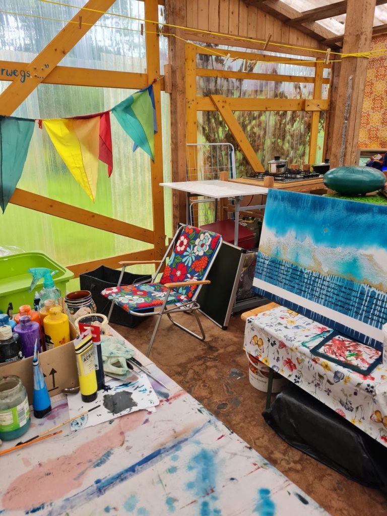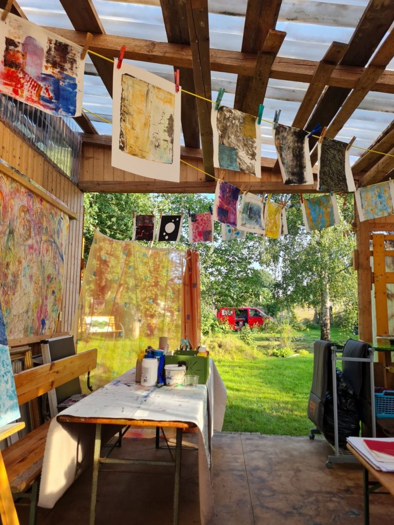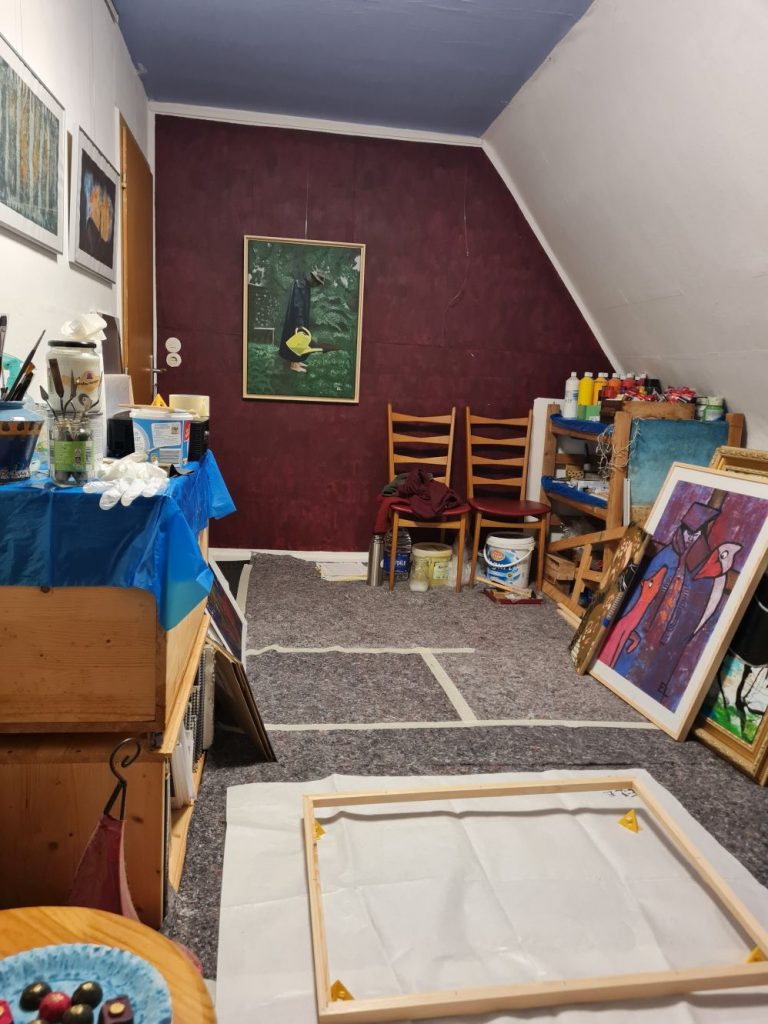 in der dunklen jahreszeit schlafe ich im haus und koche im wohnwagen. seit 2025 habe ich im Haus auch meine „kleine krumme galerie“, die mir als Winteratelier das richtige flair bietet.