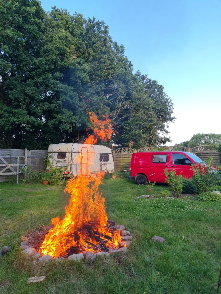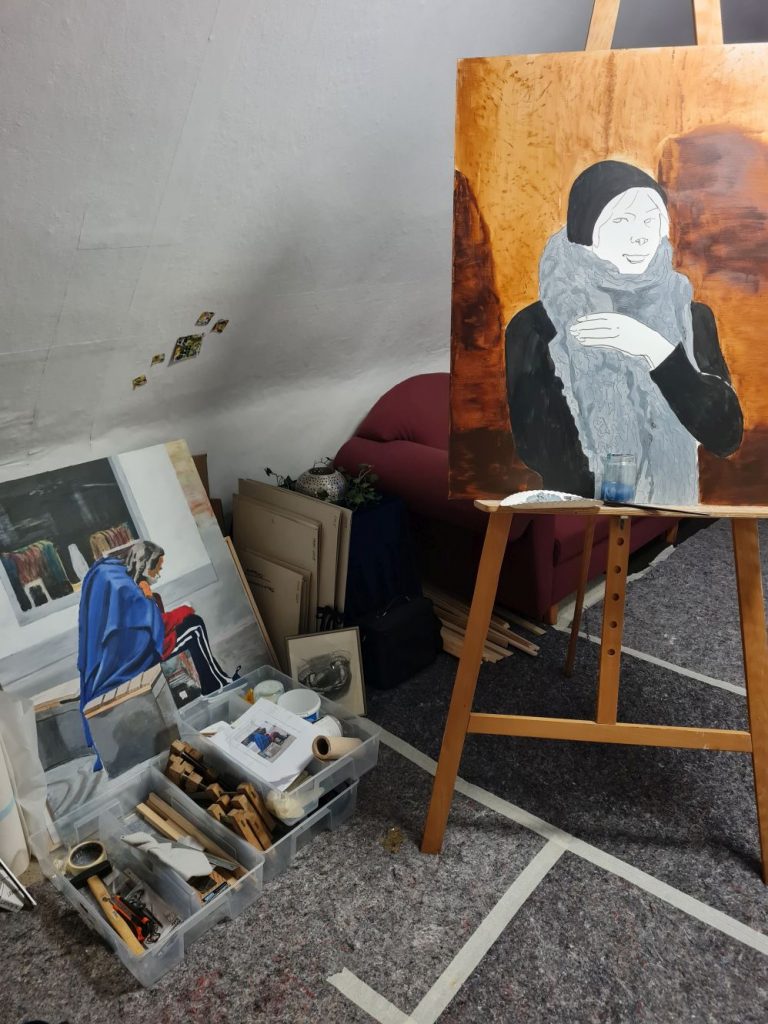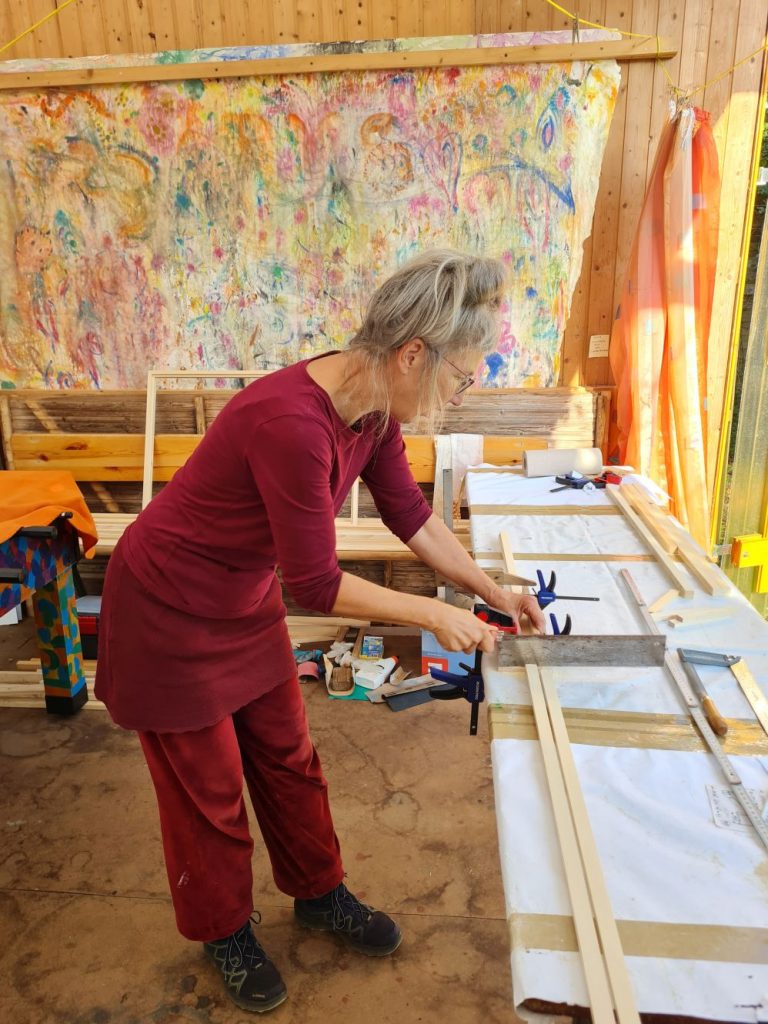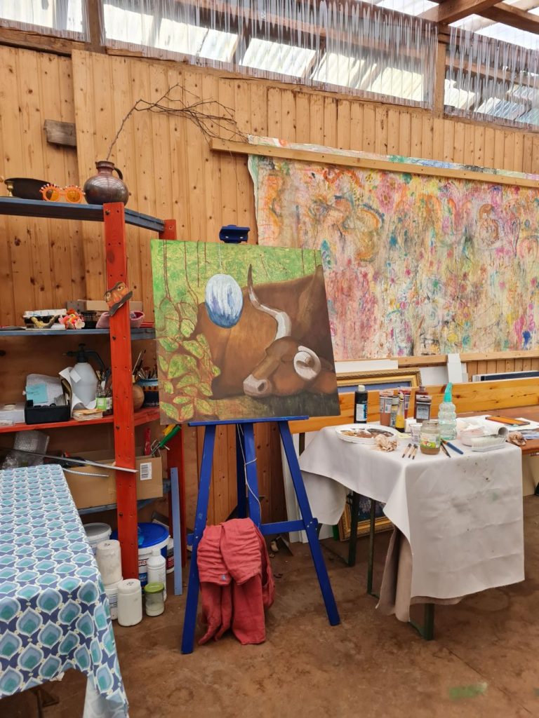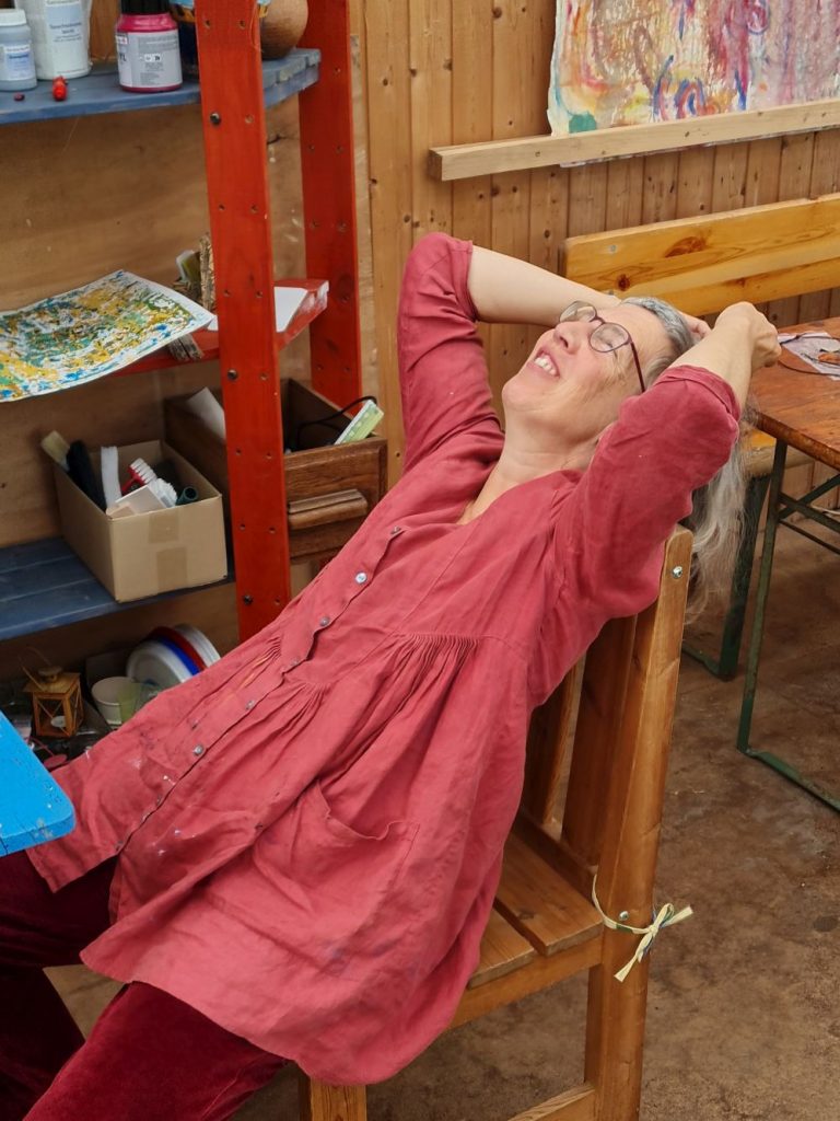 in der dunklen jahreszeit schlafe ich im haus und koche im wohnwagen. seit 2025 habe ich im Haus auch meine „kleine krumme galerie“, die mir als Winteratelier das richtige flair bietet.