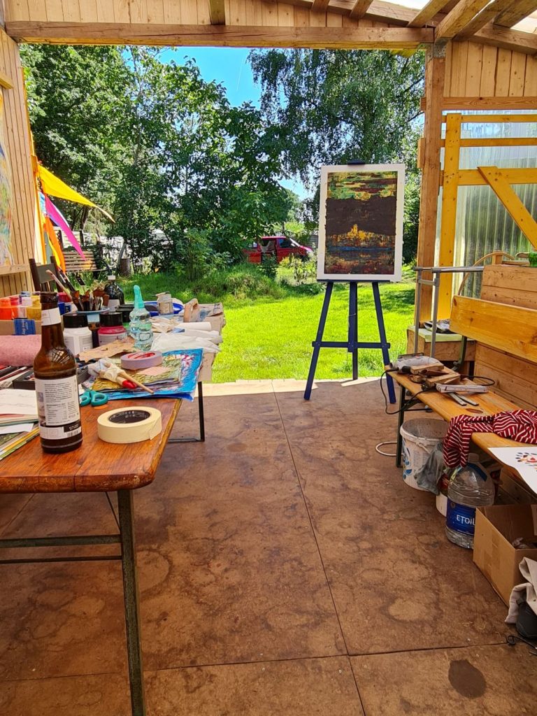 in kentucki lebe ich in der hellen jahreszeit in meinem bus und meinem wohnwagen. und so ist auch mein atelier draussen.Hin und wieder kommen gäste, die auch malen und so wurde die idee des „sommeratelier“s geboren. es findet 2026 zum zweiten mal statt.